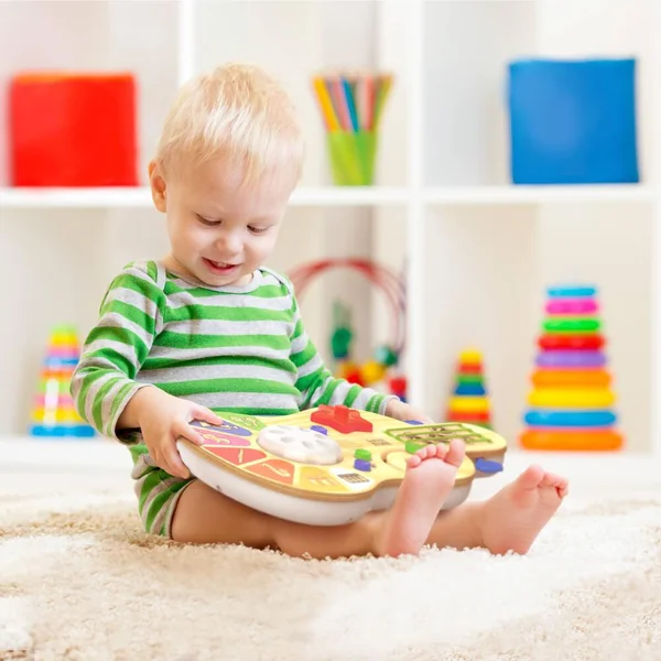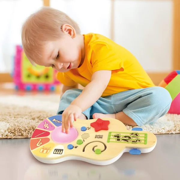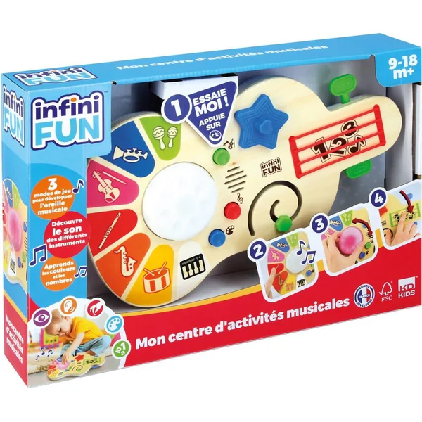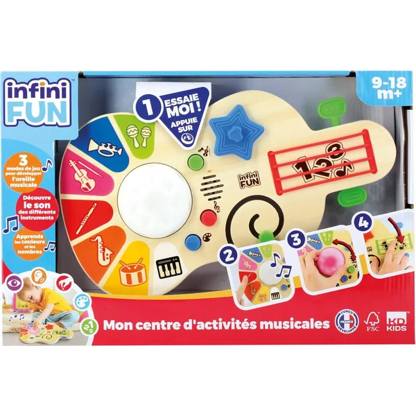 Le jouet musical qui stimule les sens avec de la lumière et des sons et qui développe la motricité fine ! Avec le centre d’activités musicales, les tout-petits peuvent exprimer toute leur créativité et développer dès le plus jeune âge leur oreille musicale ! 3 modes de jeu : Petit compositeur : en touchant les cordes ou les touches de couleur, l’enfant joue du piano ou de la guitare. Magique, la lumière s’allume de la couleur correspondante à la touche. En tournant la roue il peut transformer son piano en xylophone ou en percussion ! Orchestre : 3 mélodies sur lesquels l’enfant peut ajouter des instruments (maracas, flute, violon…) ou encore des sons amusants en tournant la roue lumineuse. Couleurs magiques : en appuyant sur les touches de couleur, l’enfant apprend ses premières couleurs et les émotions. Qui est tout rouge quand il est énervé ? À lui de retrouver les couleurs dans le mode quiz. Il apprend également à compter jusqu’à 10 en touchant les cordes. 6 activités à explorer pour développer la motricité fine et le sens du rythme de bébé : tourner la roue, tirer ou pousser, glisser une objet dans un chemin, faire Pivoter l’étoile, toucher les cordes et les textures. Parfait pour initier les tout-petits à la musique tout en décorant leur chambre !