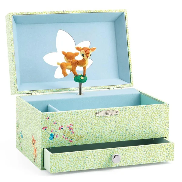 Découvrez une jolie boîte à bijoux musicale qui plaira beaucoup aux jeunes enfants. Avec un grand compartiment pour ranger tout ses trésors, un compartiment pour ranger ses bagues et un tiroir pour ses secrets. Votre enfant s’admirera devant le miroir et regardera danser le petit faon qui s’animera en musique à l’ouverture de la boîte.