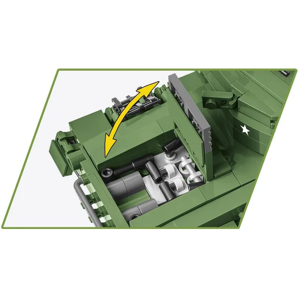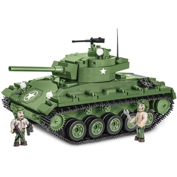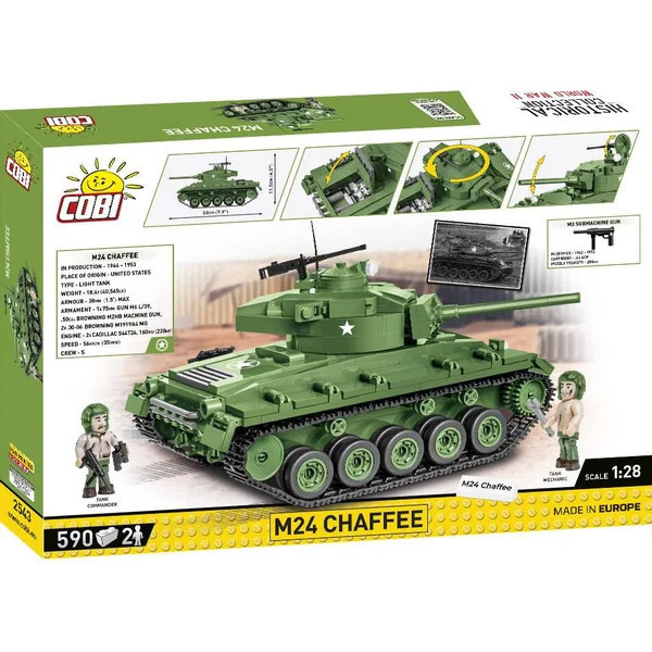 Le M24 Chaffee est composé de : 590 briques imprimées et 2 figurines soldats US. Ce modèle a des chenilles fonctionnelles, une tourelle rotative et un canon mobile. Deux moteurs factices se trouvent sous la trappe de service. La tourelle a une trappe d’ouverture et est équipée d’une mitrailleuse. Ce char léger US de la seconde Guerre mondiale fabriqué entre 44 et 45 a remplacé avec succès un autre char léger le M3/M5 Stuart. Dimensions du modèle monté : L. 20 x l. 10,50 x h. 11,50 cm.