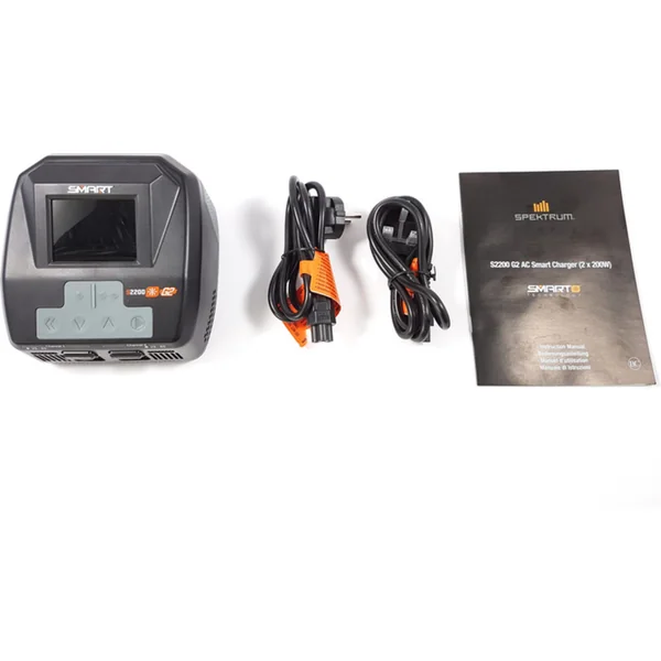 L’emballage comprend le chargeur Spektrum Smart S2200 2x200W AC, un câble d’alimentation, un manuel en SK, un manuel en EN, DE, FR, IT.