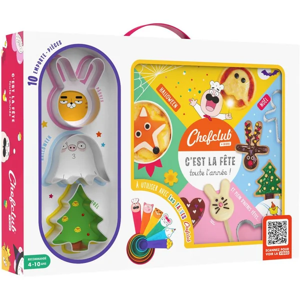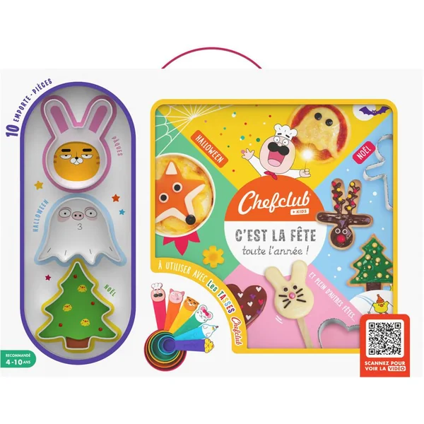 Les enfants vont faire la fête toute l’année grâce à plus de 20 recettes ludiques et gourmandes. Les petits chefs peuvent suivre les illustrations des recettes pour cuisiner en toute autonomie avec les 10 emporte-pièces rigolos fournis dans le coffret. Un livre de recettes autour des fêtes du calendrier à réaliser avec les Tasses Chefclub (non fournies dans le coffret). 1 poster-calendrier et 3 planches d’autocollants rigolos. 10 emporte-pièces à utiliser dans les recettes salées et sucrées du livre. Toutes les recettes disponibles en vidéos via des QR codes faciles à scanner.