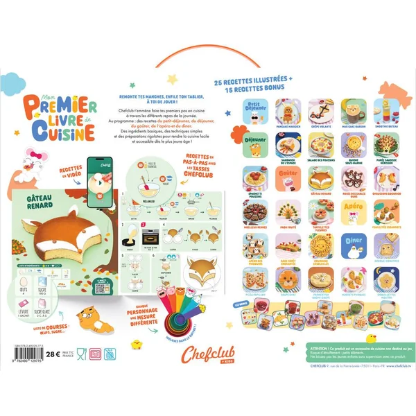 Il permettra aux plus jeunes de cuisiner tout au long de la journée à travers les recettes du petit-déjeuner, déjeuner, goûter, apéro et dîner. Pour encore plus accompagner l’enfant dans la réalisation des recettes en autonomie, le livre est interactif : toutes les recettes sont disponibles en vidéo via des QR codes faciles à scanner. Les 6 tasses Chefclub sont en plastique non-toxique, sans BPA.