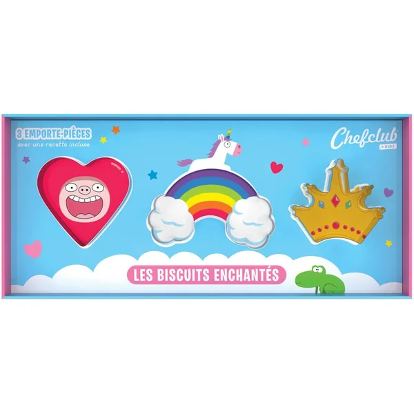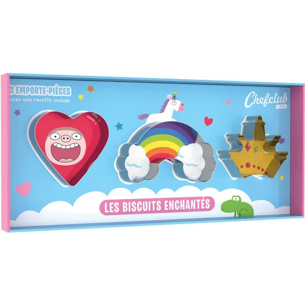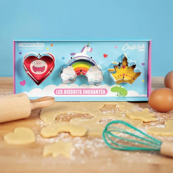 Les biscuits enchantés est un kit de 3 emporte-pièces en métal : le coeur, l’arc-en-ciel et la couronne. Une recette illustrée en pas-à-pas à réaliser avec les emporte-pièces est incluse dans le packaging. 3 emporte-pièces en métal : le cœur, l’arcenciel et la couronne. Les emporte-pièces passent au congélateur et au lavevaisselle. Recette de biscuits illustrée en pas-à-pas et en vidéo incluse.