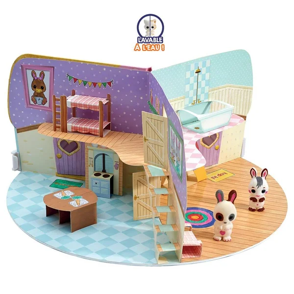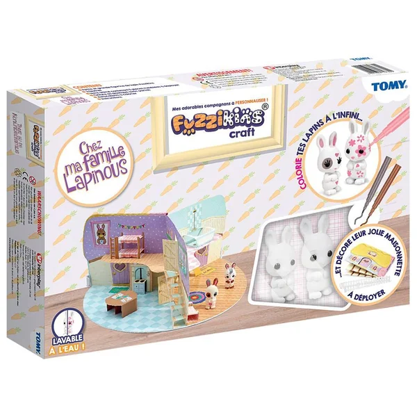 Fuzzikins ce sont d’adorables animaux tout doux à colorier et personnaliser ! Le pack « Chez la famille Lapinou » offre des heures de jeu et de création, il permet de personnaliser sa famille Lapinou et leur maison et aussi de customiser leur habitat avec des sticklers à colorier. Le pack « Chez la famille Lapinou » vient avec 2 figurines de lapin, une maison livret à déplier, très facile à ranger et transporter! Des accessoires pour décorer la maison et les différentes pièces: la cuisine, le salon, la salle de bain, la chambre et le jardin. Vous n’êtes pas satisfait par la personnalisation de votre Fuzzikins? Recommencez à l’infini! Les fuzzikins sont lavables pour des heures de jeu en perspective.