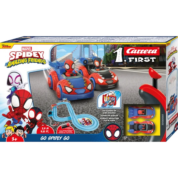 Peter Parker, abrégé Spidey, rejoint son ami Miles Morales – alias Spin – de la série « Spidey et ses super amis » et sur la piste de 2,9 mètres, il appuie sur l’accélérateur. La piste de course Carrera FIRST alimentée par batterie représente de grands défis pour les jeunes coureurs – y compris des lignes droites, des virages, un rétrécissement de la piste – et beaucoup de plaisir !