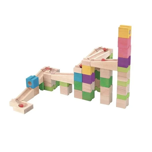 Circuit de Billes – 68 pièces : l’enfant assemblera avec précision les différentes pièces en bois pour créer un circuit de billes, une multitude de combinaisons possibles pour des heures de plaisir !