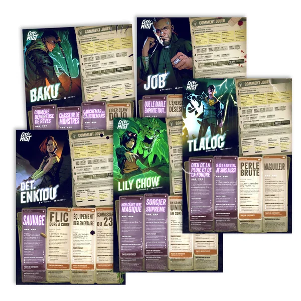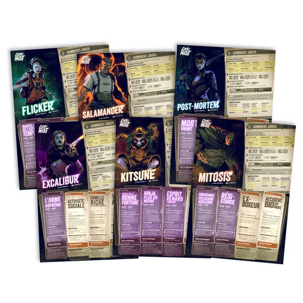 Outil idéal pour initier des joueurs à City of Mist ou pour lancer une campagne, ces feuilles de personnages guideront les joueurs dans le développement de leur alter ego, leur donneront des idées de combinaison d’atouts ou pourront les inspirer dans la création de leurs propres Mythos ou Logos.
