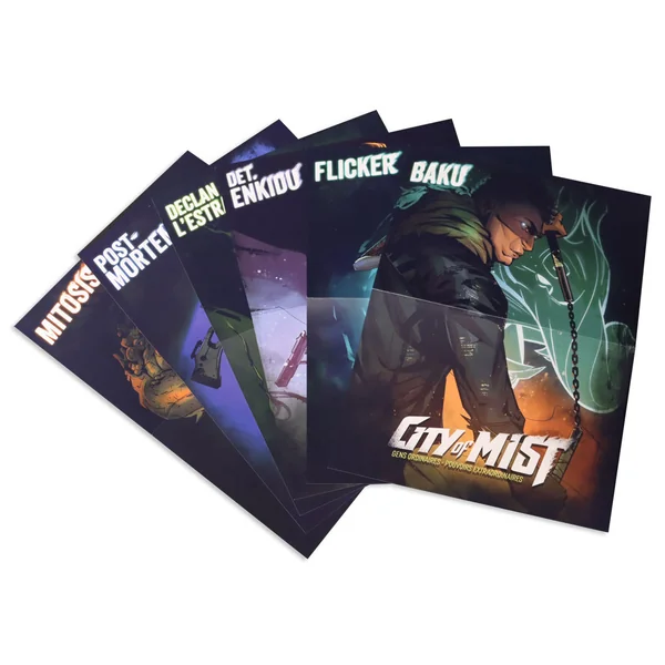 Ce pack de personnages contient 12 dossiers de personnages en grand format pour vos parties de City of Mist. Ces personnages sont issus du Kit de Découverte et des Accessoires de la MC.