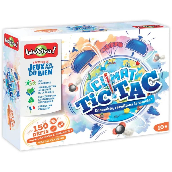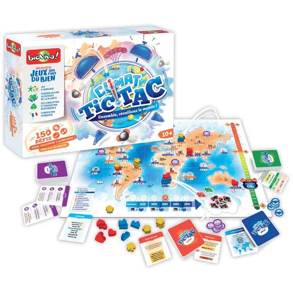 Le jeu de coopération et de stratégie Climat Tic-Tac de Bioviva Éditions est un jeu de société pour s’amuser en famille. Il sensibilise les enfants sur le problème du réchauffement climatique. Il les aide également à connaître les solutions destinées à réduire les émissions de CO2.