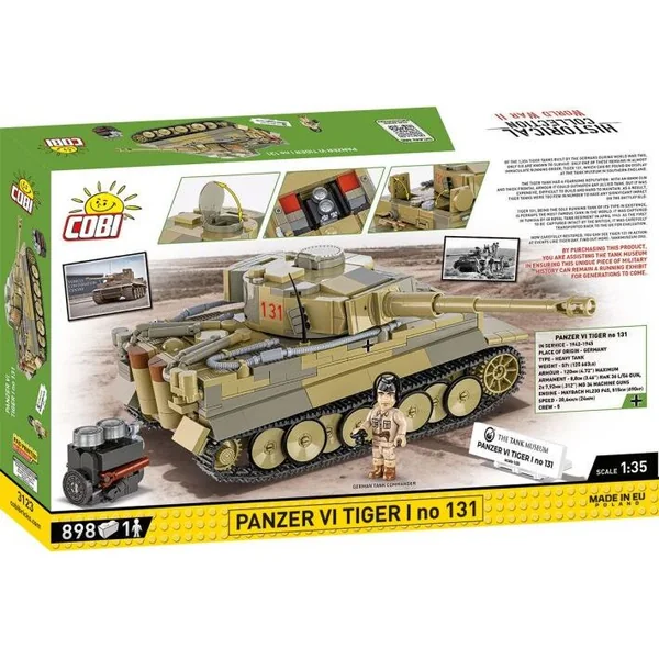 Le bloc Tiger 131 a été reproduit avec une attention particulière aux détails dans l’échelle très populaire de 1:35 ! Il convient de souligner que c’est la première fois que COBI sort le légendaire Tiger 131 à cette taille ! Le modèle possède des éléments mobiles, tels que la tourelle et le canon, ainsi que des roues et des chenilles rotatives. L’ensemble complexe se compose de 898 éléments et reflète fidèlement les formes originales de son inspiration historique. Notre char à blocs performant est recouvert d’impressions de haute qualité qui ne s’effacent pas. Une attention particulière est accordée aux couleurs, qui sont proches de l’original, ce qui rend le modèle éblouissant ! Le kit comprend un mini modèle du moteur Maybach, qui peut être exposé à côté du modèle ou placé dans le char sous le panneau de service. Le modèle a des roues mobiles et des chenilles composées de nombreux maillons. Pendant le jeu, vous pouvez manœuvrer le char et observer la chenille en fonctionnement ! Les trappes sont ouvertes et sous elles se trouve de l’espace pour des figurines COBI standard. Sur l’image, le commandant du char est représenté en uniforme tropical. L’ensemble est complété par une étiquette blanche avec le nom du char imprimé et le logo du Tank Museum ! Construisez l’histoire, pièce par pièce, et complétez votre collection de Panzer.