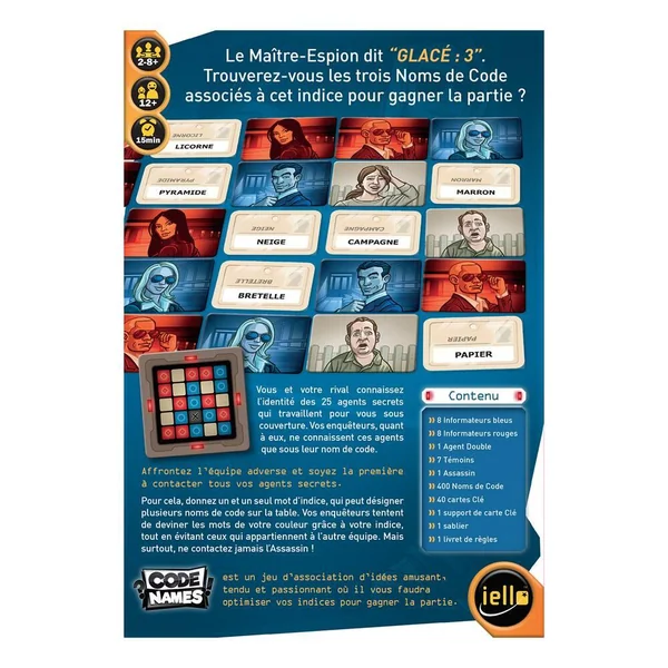 Codenames comprend : 8 tuiles informateur bleu, 8 tuiles informateur rouge, 1 tuile agent double, 7 tuiles témoin, 1 tuile assassin, 200 cartes nom de code, 40 cartes clé, un support de carte clé et un livret de règles. Tout ce qu’il faut pour des parties passionnantes et pleines de rebondissements.