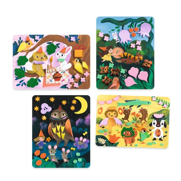 Une activité de collage scintillante pour créer 4 tableaux féériques grâce à des mousses autocollantes métallisées et pailletées. Une première découverte de la mosaïque, où l’enfant apporte éclat et magie aux scènes festives d’animaux… tout en développant sa motricité fine.