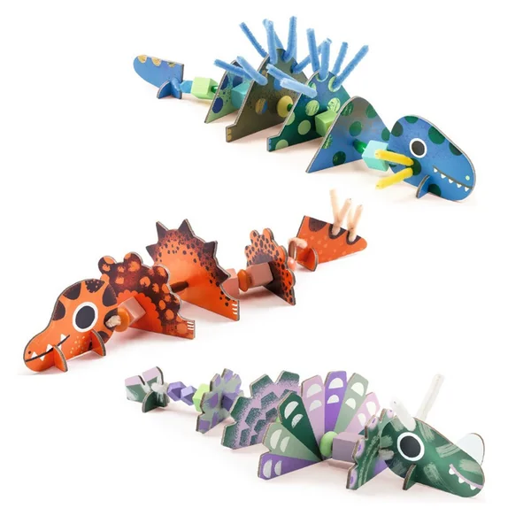 Une activité originale pour donner vie à 3 dinosaures à la fois gentils et terribles ! Sur le fil chenille, l’enfant enfile perles de bois et éléments prédécoupés en carton épais pour créer ses modèles. Une activité qui stimule la créativité, la motricité fine et l’imagination, avec des possibilités infinies de combiner les éléments et d’inventer ses propres dinosaures.