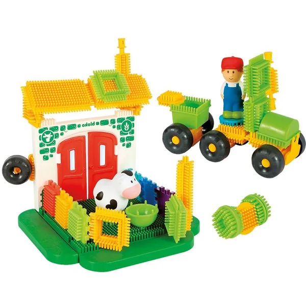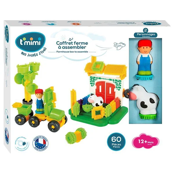 Coffret contenant 60 pièces de différentes couleurs et formes permettant différentes combinaisons et constructions sur le thème de la ferme. Comprend 2 figurines 3D : 1 personnage et 1 vache. Tu peux encastrer les personnages sur les blocs. Parmi les pièces il y a également des roues incluses pour créer des véhicules : par exemple un tracteur. En plastique. Développement de la coordination main/œil. Amusant et facile à manipuler.