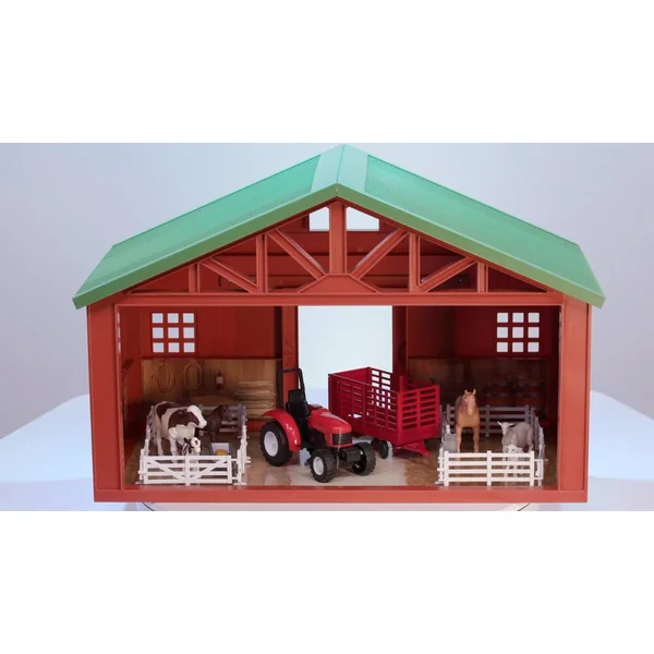 Coffret ferme contenant une grange XXL avec toit et portes ouvrants livrée avec un tracteur de ferme avec sa remorque à ridelles, 1 jument et son poulain, 1 vache et son veau, 1 chèvre et son chevreau et diverses barrieres et accessoires.