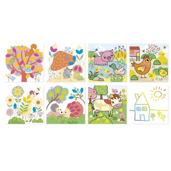 Décore et colorie de jolis tableaux animaux ! Ce coffret multiactivités permet de réaliser 4 tableaux à compléter avec de l’encre à doigts et 1 tampon, ainsi que 2 tableaux recto/verso à colorier avec un feutre à eau. Le feutre à eau est magique : les couleurs disparaissent lorsqu’elles sèchent ! Les enfants peuvent recommencer à l’infini.