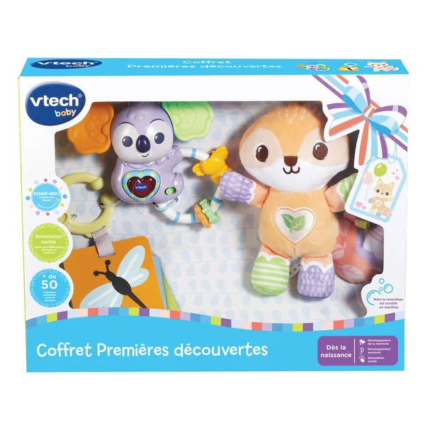 Un coffret complet avec les premiers jouets indispensables de Bébé ! • Un premier coffret complet avec trois jouets indispensables pour permettre à Bébé de faire ses premières découvertes. • Un renardeau en peluche toute douce qui éveille les sens de bébé grâce à ses nombreuses matières et textures : papier bruissant, broderies, rubans, tissus, … et qui déclenche un bruit mécanique lorsqu’on appuie sur son bouton Coeur. • Un hochet koala électronique avec détecteur de mouvement pour déclencher des phrases et des sons amusants lorsque Bébé le secoue. En appuyant sur le bouton coeur lumineux, il déclenche des chansons et des mélodies pour s’éveiller en musique. • Les billes à manipuler l’aident à développer sa motricité fine. • Un hochet composé de 3 cartes visuelles recto-verso résistantes à l’eau lui permettra de développer sa vue et son imaginaire.