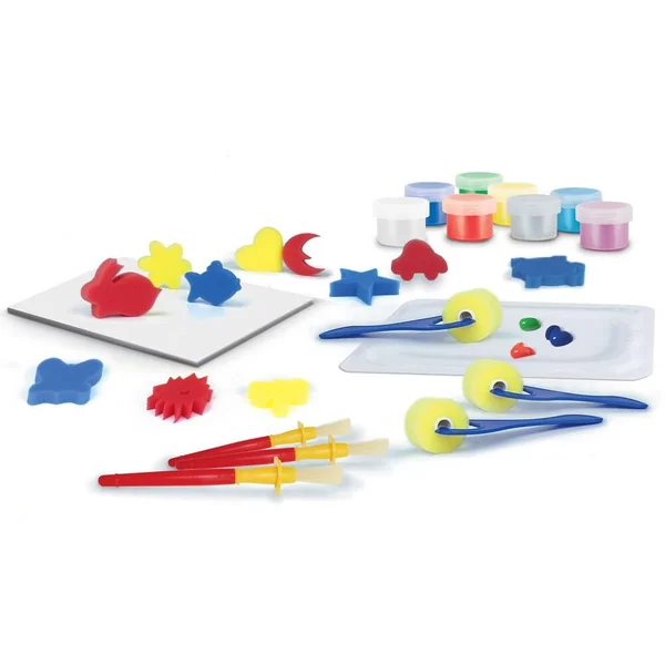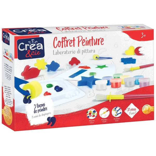 Coffret pour s’initier à la peinture. 37 pièces au total. 3 façons de peindre : mousses, pinceaux et rouleaux. Peinture lavable. Contient : 12 mousses en forme d’animaux ou d’objets, 3 pinceaux de 18 cm, 3 roulettes, 8 pots de peinture peinture à l’eau de 20 ml (gouache), 1 palette en plastique et 10 feuilles blanches. Facile à utiliser. Développe la créativité.