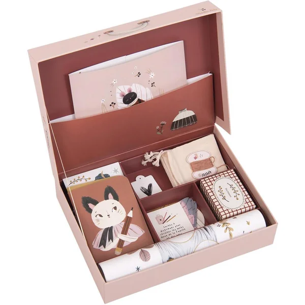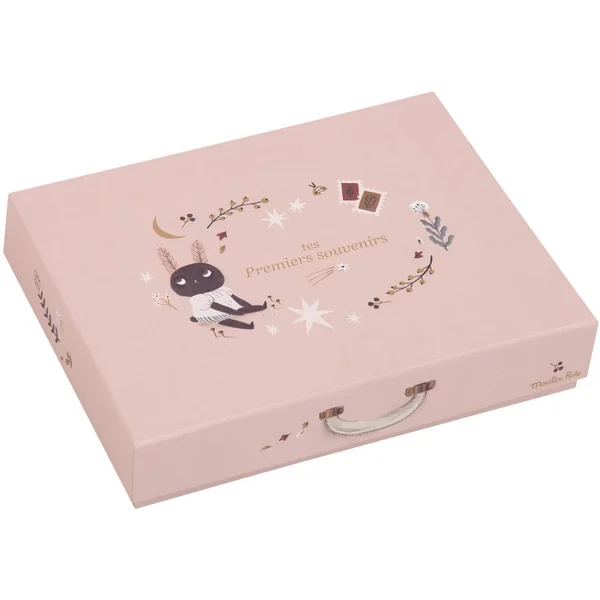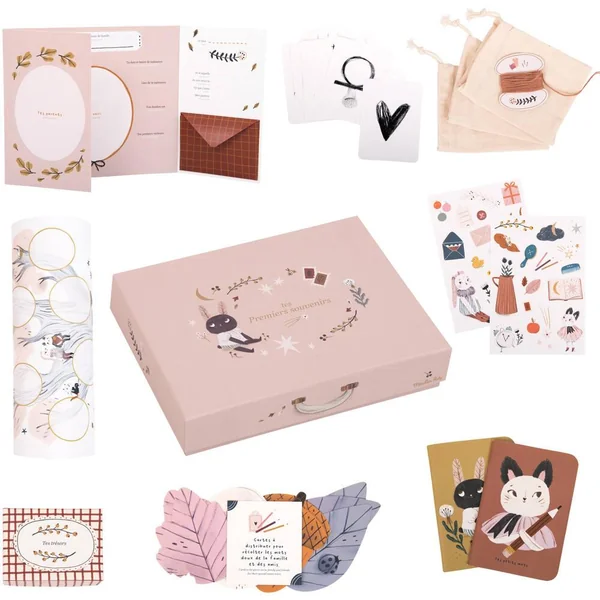 Tous tes premiers souvenirs, rassemblés dans un coffret illustré. Petits carnets de notes, images à distribuer, stickers, sachets en tissu ou boîte à trésors, et même un poster avec ton arbre généalogique… Tout se rejoint, etse conserve précieusement.