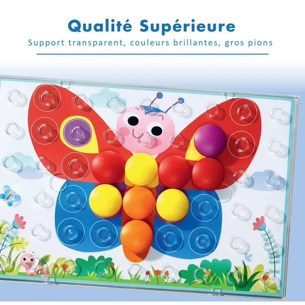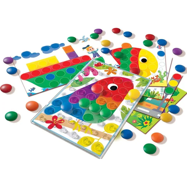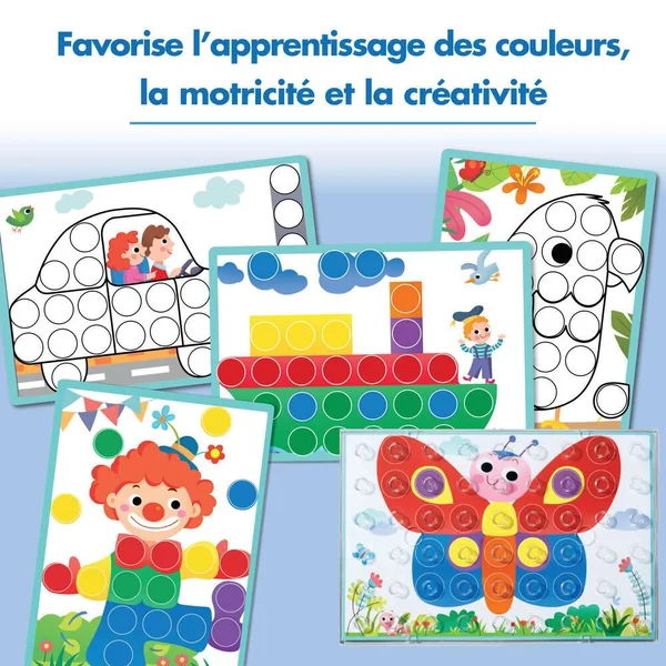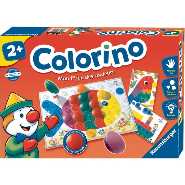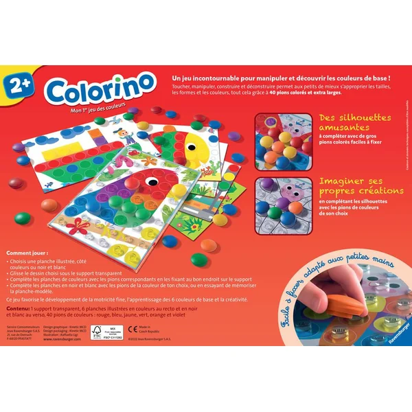 Toucher, manipuler, construire et déconstruire permet aux petits de mieux s’approprier les tailles, les formes et les couleurs. Avec ce jeu incontournable, les enfants jouent à compléter des silhouettes amusantes avec de gros pions colorés et faciles à fixer, sur un grand support transparent. Les 6 fiches recto-verso leur offrent la possibilité de suivre le modèle, ou de créer des combinaisons de couleur en toute liberté. Les 40 pions extra larges et aux couleurs variées (bleu, jaune, rouge, vert, orange et violet) offrent aux petites mains un confort de jeu optimal, et donne aux enfants l’envie de jouer, encore et encore ! Ce jeu favorise ainsi le développement de la motricité fine, l’apprentissage des 6 couleurs de base et la créativité. Dès 2 ans. Ce produit est composé de matériaux issus de forêts bien gérées certifiées FSC®, de matériaux recyclés et de matériaux issus d’autres sources contrôlées (FSC-C111262).