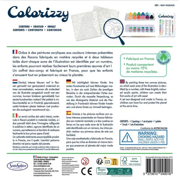 Cette gamme de peintures par numéros a été réalisée avec des designs simples et adaptés aux jeunes artistes. Les pots très stables, fabriqués en matière recyclée, contiennent une peinture acrylique en pigments qui permet de créer ses premières oeuvres d’art avec des couleurs vibrantes et couvrantes. Ils seront guidés par des contours et des numéros qui disparaîtront parfaitement sous une couche de peinture. Petit à petit, le tableau prendra vie à chaque couleur ajoutée. Un coffret éco-conçu et fabriqué en France, pour que les enfants s’amusent tout en préservant au mieux la planète. 2 tableaux en papier toilé contrecollé (22 x 22 cm). 12 couleurs de peintures acryliques non toxiques. 1 pinceau de très grande qualité. 1 palette pour mélanger les peintures. 1 notice multilingue sur la perception des couleurs