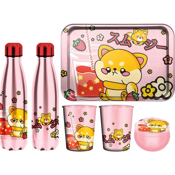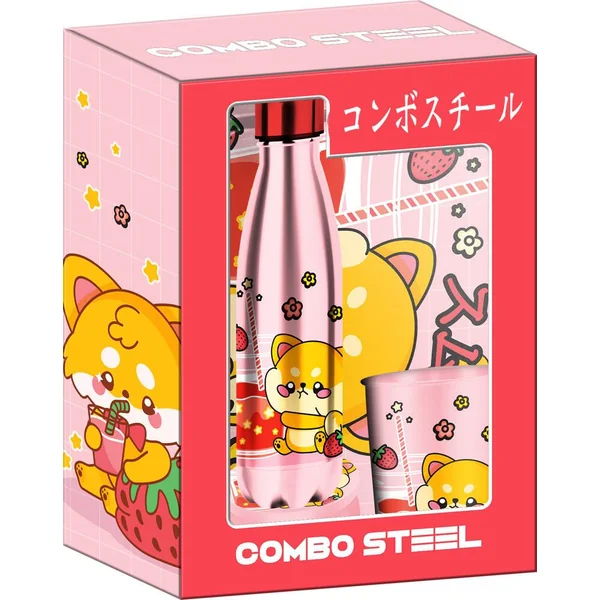 Coffret 100% Métal et 100% Kawaii contenant une bouteille isotherme double paroi, pour maintenir le chaud comme le froid tout le long de la journée, un plateau multi-fonctions, un mug et une boîte à bonbons.