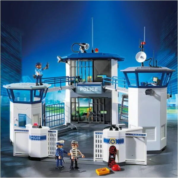 Alerte ! Le prisonnier tente de s’évader ! Le commissariat de police comprend deux cellules et la tour permet de contrôler le bâtiment, mais le prisonnier parvient à s’échapper grâce au mur cassable ! Pas de panique, les policiers peuvent le retrouver avec la boîte de prise d’empreintes digitales. Comprend trois personnages, une hélisurface pour l’hélicoptère réf. 6921 et un mur cassable pour l’évasion. La voiture de policiers avec gyrophare et sirène réf. 6920 peut se garer dans la cour du commissariat.