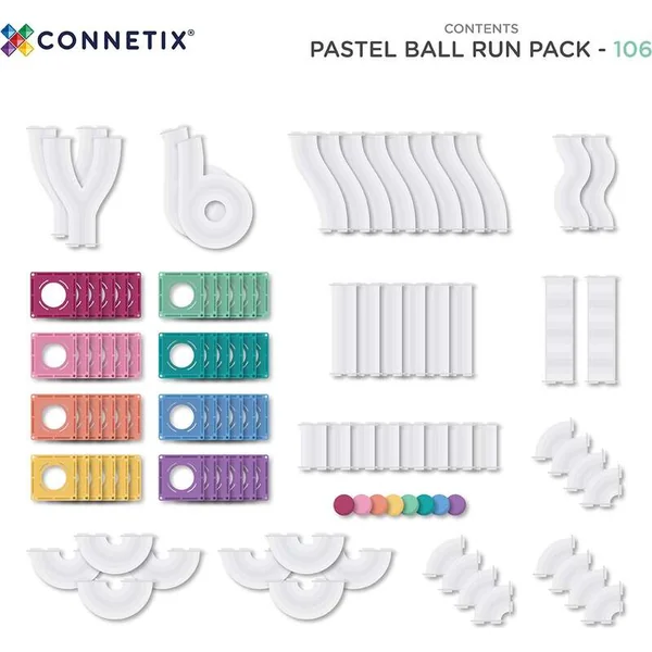 Profitez du potentiel illimité offert par le Pack de 106 pièces de la Piste à billes Pastel ! Il contient des pièces pastel à assembler et 8 billes en bois pastel, ainsi que nos pièces classiques pour la piste à billes – des tubes transparents rainurés, uniques et conçus exclusivement, 2 tubes à effet sonore d’escalier (tubes soundscape), 2 tubes en forme de S et 2 tubes de répartition pour des courses amusantes ! C’est le complément parfait à nos packs standards CONNETIX et un excellent moyen d’explorer les concepts STEAM.