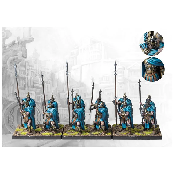 Alors que les Hoplites sont les soldats citoyens d’une Cité-Etat donnée, les Phalangites sont son armée professionnelle. Vétérans durs à cuire et marqués par d’innombrables campagnes, les Phalangistes prennent tout ce qui rend une phalange mortelle, et le font monter d’un cran. En évitant l’utilisation du hoplon (bouclier), leurs exercices quotidiens leur permettent d’utiliser leurs piques, la redoutable sarissa, tout en restant en formation. Ils deviennent ainsi à la fois un marteau et une enclume, ce qui leur permet de conserver leur caractère défensif tout en écrasant l’adversaire derrière une haie impénétrable.