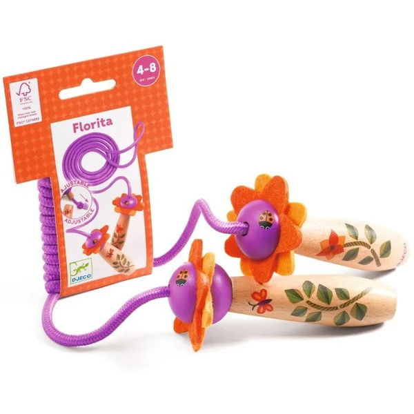 Florita est une corde à sauter en bois certifié FSC aux manches en forme de fleurs joliment décorés. Très pratique, la longueur de la corde peut être ajustée à la taille de l’enfant, il suffit de dévisser la fleur et de régler la hauteur des nœuds sur la corde pour adapter sa longueur.
