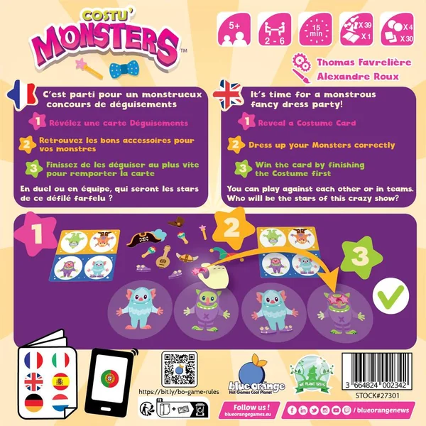 Zut ! C’est aujourd’hui qu’a lieu le concours de déguisements. Vos monstres ne sont pas du tout prêts. Vous filez dans la chambre et ouvrez la malle à accessoires. Et c’est parti ! Vêtements, chaussures, chapeaux, lunettes… vous sortez tout de la malle pour habiller vos amis et les transformer en vrais stars de défilé !