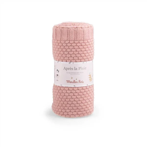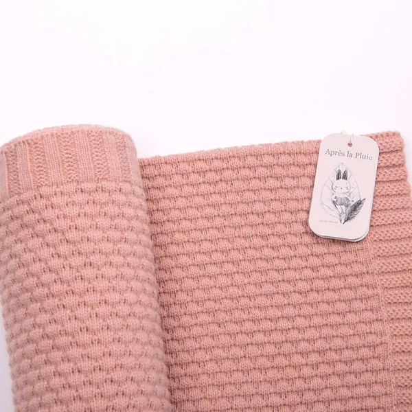 Couverture en tricot rose certifiée OEKO-TEX® qui aide les petits à réguler leur température corporelle grâce aux matières utilisées : 25% coton, 25% viscose, 25% polyamide, 22% laine mérinos et 3% cachemire.