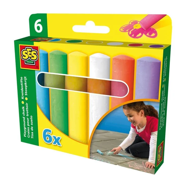 Boîte de six grandes craies de trottoir. Craies de haute qualité et de couleurs vives parfaites pour le dessin sur diverses surfaces extérieures. SES est le spécialiste des jouets créatifs depuis plus de 40 ans. Le développement de l’enfant est le concept central du développement de nos produits. Il est important que l’enfant ait la possibilité de développer ses talents et d’utiliser sa créativité en toute sécurité. Les produits que nous développons sont essentiels pour les différents stades de développement de tout enfant, apportant créativité, qualité et sécurité.