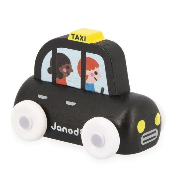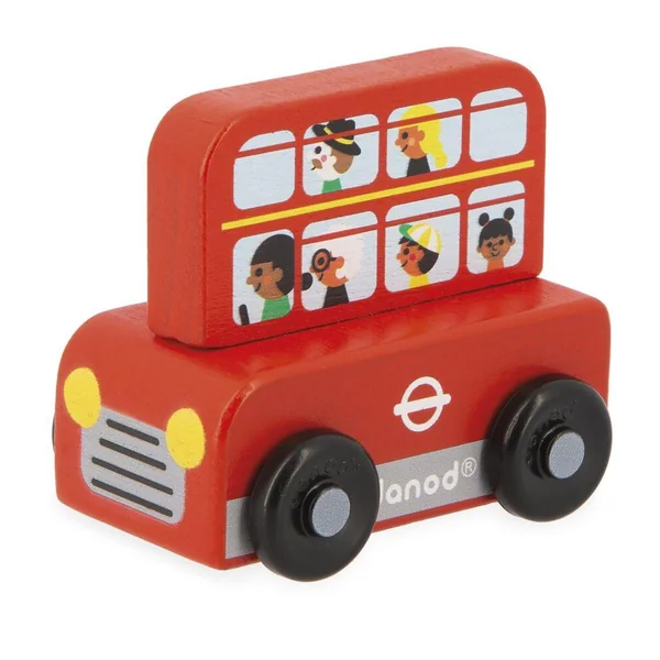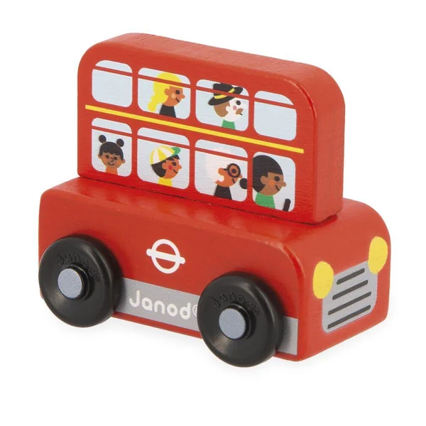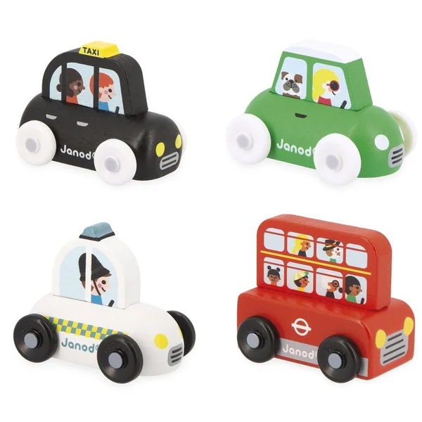 Voyage au Royaume-Uni avec ces 4 adorables véhicules à collectionner ! Dans ce display on retrouve 4 véhicules : 1 bus rouge à deux étages remplis de touristes prêts à visiter la ville, 1 taxi londonien, 1 voiture de police avec comme conducteur un policier au couvre-chef caractéristique du Royaume-Uni, et enfin une petite citadine de couleur verte avec un bulldog rigolo à bord ! Ces véhicules sont spécialement concus pour être faciles à prendre en main par les tous petits. Idéal pour développer la motricité fine et l’imagination. Jouet en bois FSCTM. Pour les enfants à partir de 12 mois.
