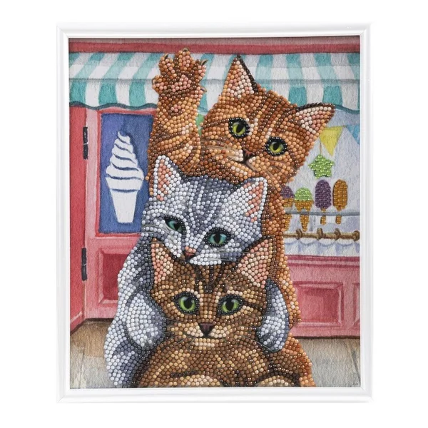 Présentation du charmant kit de cadre photo en cristal « Kitten & Ice Cream », mettant en vedette trois chatons attachants prenant des poses devant un magasin de crème glacée, anticipant probablement une friandise sucrée. Offrez-vous cette délicieuse activité artisanale et, une fois terminée, exposez avec élégance votre création colorée à l’aide du cadre blanc contemporain inclus. Un choix idéal pour insuffler de la joie dans votre espace de vie ou comme cadeau sincère fait main.