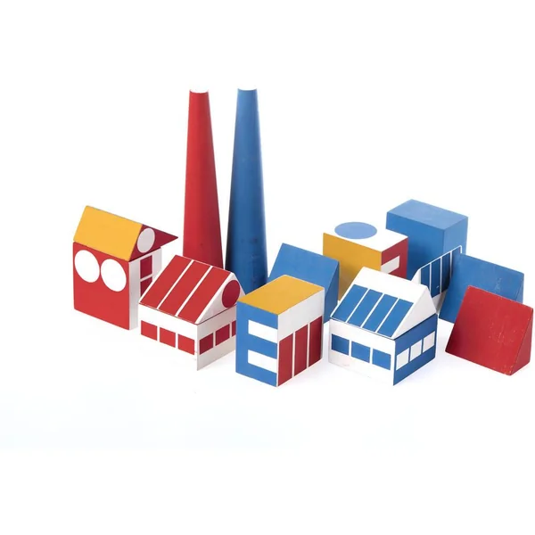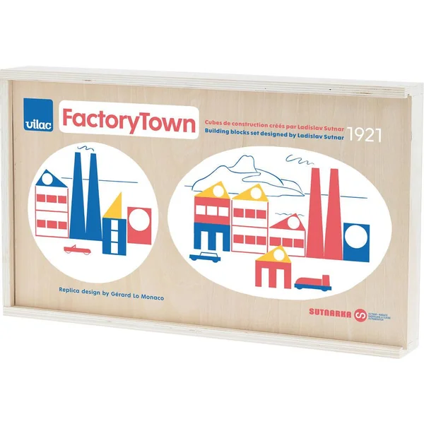 Tchécoslovaque né en 1897 à Pilsen et mort en 1976 à New York, Ladislav Sutnar est un pionner du design graphique et partage avec ses contemporains du mouvement artistique Bauhaus le goût des couleurs vives et des formes géométriques simples. Concepteur de jeux, il crée en 1921 la « Factory Town », un jeu de cubes pédagogique très épuré que Vilac réédite 100 ans après en collaboration avec l’artiste Gérard Lo Monaco et la Ladislav Sutnar Faculty of Art and Design. 3 exemplaires uniques sont encore existants dans le monde dont un exposé au MoMa de NY.