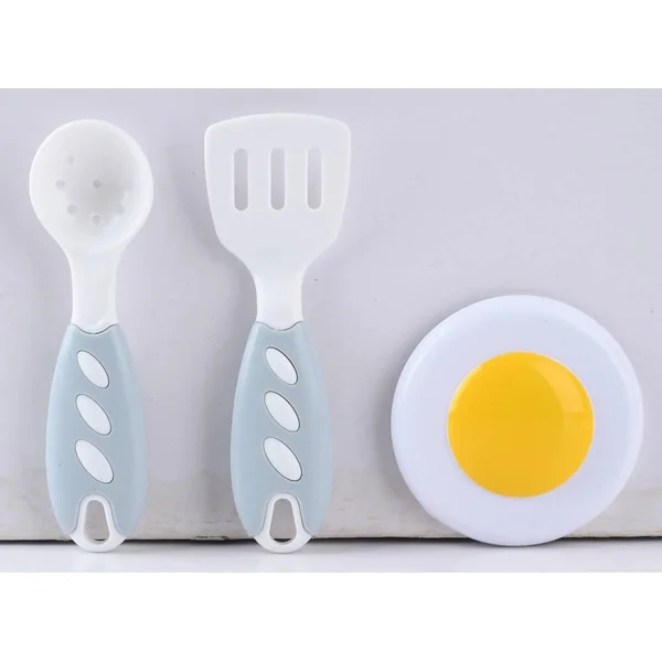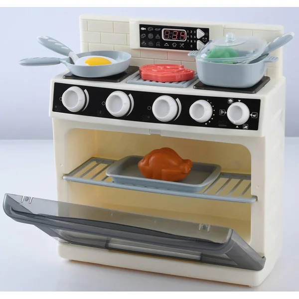 La Cuisinière est accompagnée de nombreux accessoires, y compris une grille et une plaque pour le four, une poêle, une marmite avec couvercle, un morceau de viande rouge, un poulet, un œuf au plat, un légume vert et deux ustensiles. Tous ces éléments sont fabriqués en plastique résistant, garantissant une utilisation sûre et durable pour les petits chefs en herbe.