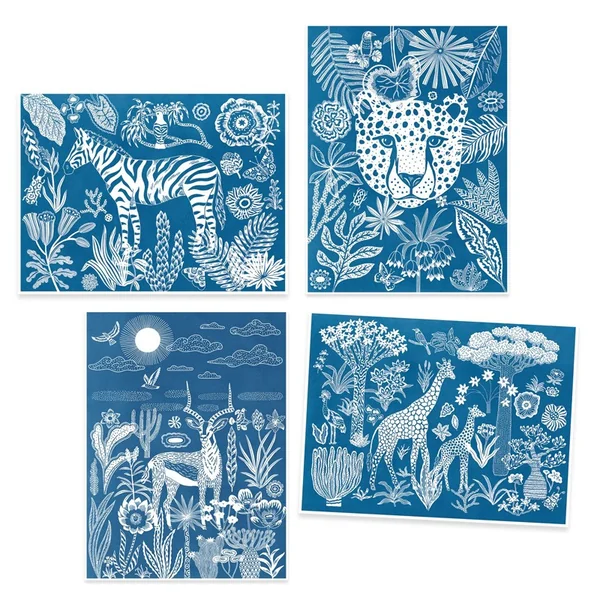 Magique, cette activité s’inspire d’un procédé emprunté à la photographie : le cyanotype. À l’aide de motifs opaques, l’enfant crée des scènes illustrées sur un papier photosensible. Après une exposition au soleil, le papier est marqué des motifs en négatif. Il n’y a plus qu’à rincer le papier dans un bain d’eau claire et les créations se révèlent sur fond bleu ! Des motifs riches et variés pour créer 4 tableaux nocturnes et poétiques.