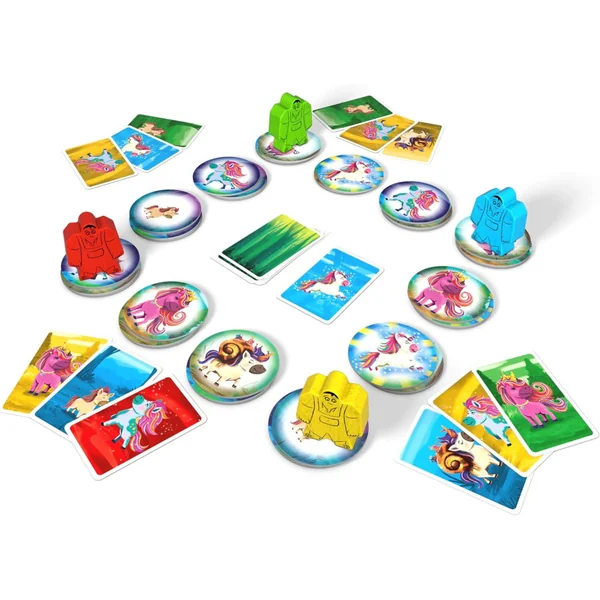Dans Das Kleinhorn vom Riesenwald, des cartes de couleur judicieusement jouées permettent à quatre géants de se précipiter à travers la forêt pour garder des licornes. Il y en a un nombre incroyable : petites licornes, licornes sans licornes, licornes en morceaux, et bien sûr licornes cochons, licornes baveuses et licornes soleil.