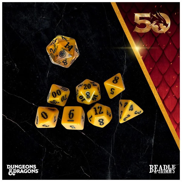 • Un set standard de sept dés en résine, accompagné d’un dé 20 exclusif surdimensionné