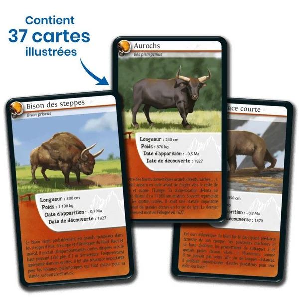 Partez à la rencontre des animaux préhistoriques et pariez sur leurs points forts pour gagner la bataille ! Alors, prêts à relever le défi ? Caractéristiques : Longueur – Poids – Date d’apparition – Date de découverte