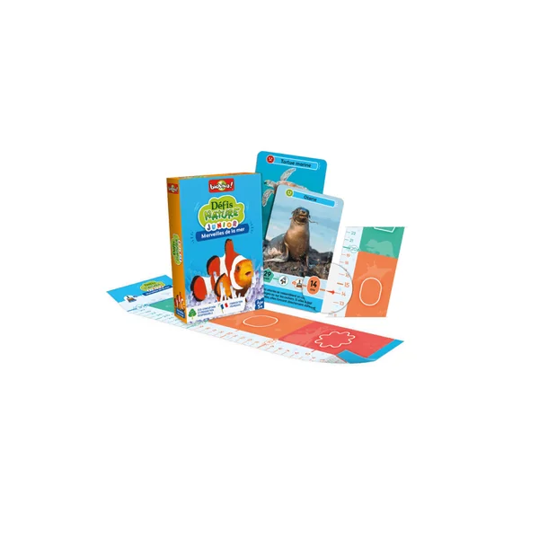 Le principe de Défis Nature Junior – Merveilles de la mer est simple : les enfants, à partir de 5 ans, parient sur la vitesse ou la longévité des animaux. Celui qui possède la plus forte caractéristique remporte les cartes des autres joueurs. Le joueur ayant collectionné le plus de cartes à la fin de la partie, l’emporte.Le + du jeu : À l’aide de la toise, les enfants peuvent facilement comparer leurs nombres.