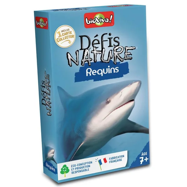 Défis Nature vous emmène à la rencontre des requins les plus étonnants de notre planète. Découvrez les espèces à préserver, puis pariez sur les points forts de vos squales pour collecter toutes les cartes du jeu et remporter la partie. Contient : 36 cartes et 1 règle du jeu. Durée : 20 minutes. De 2 à 6 joueurs. Fabriqué en France. Gamme Défis Nature : Des contenus éducatifs uniques, double pion de platine (2,5 Millions de jeux vendus à date), 1 étoile du Jouet 2018 élu par les enfants.