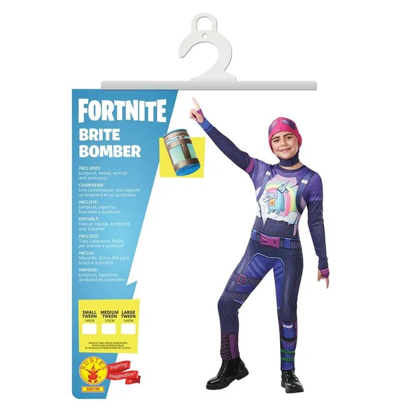 Déguisement ado Brite Bomber taille XXXL comprenant une combinaison imprimée avec impression digitale recto-verso, des manches longues imprimées recto-verso, une cagoule en tissu avec impression digitale recto-verso, un brassard en tissu à attacher autour du bras, un couvre-canette Gourde du Brave. Chaussures non fournies.