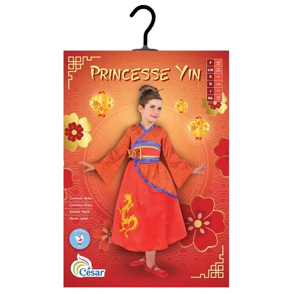 Robe de princesse chinoise. Top façon kimono décoré de galons, ceinture appliquée imprimée. Jupe imprimée et décorée de galons. Chaussures et baguettes non incluses.