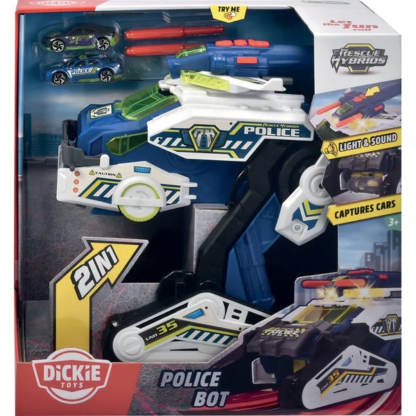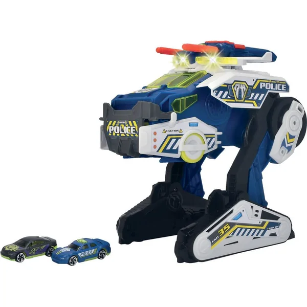 Véhicule Police Bot à roue libre avec fonction de transformation, fonctions sons et lumière, lanceur de fléchettes, fonction collecte de voitures, drone détachable du robot + 2 véhicules en métal à roue libre à l’échelle 1/64 inclus. 35 cm-