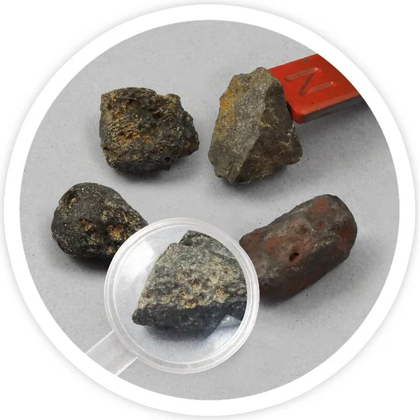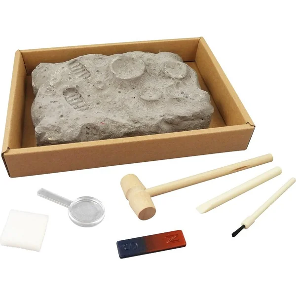 Utilisez les outils fournis pour « déterrer » et analyser cinq pierres spatiales et deux insignes de missions spatiales. Creusez progressivement de véritables météorites, tektites et magnétite dans un bloc de plâtre imitant la surface lunaire. Avec d’autres outils, nettoyez les pierres et examinez leurs propriétés à l’aide d’une loupe et d’un aimant.