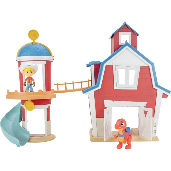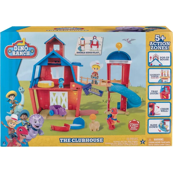 Dino Ranch. Coffret le Clubhouse. Bienvenue au Dino Ranch Clubhouse, le lieu de rencontre des Dino Ranchers ! Contient : 1 Clubhouse modulable de 31 cm, 1 figurine Jon de 7.5 cm, 2 figurines Dino (Blitz 7.5 cm et Booper 5 cm), 1 véhicule roues libres, et des accessoires. Clubhouse avec effets sonores et lumineux. 3 piles boutons (LR44) fournies. Fonction Try Me. Notice incluse. En plastique.