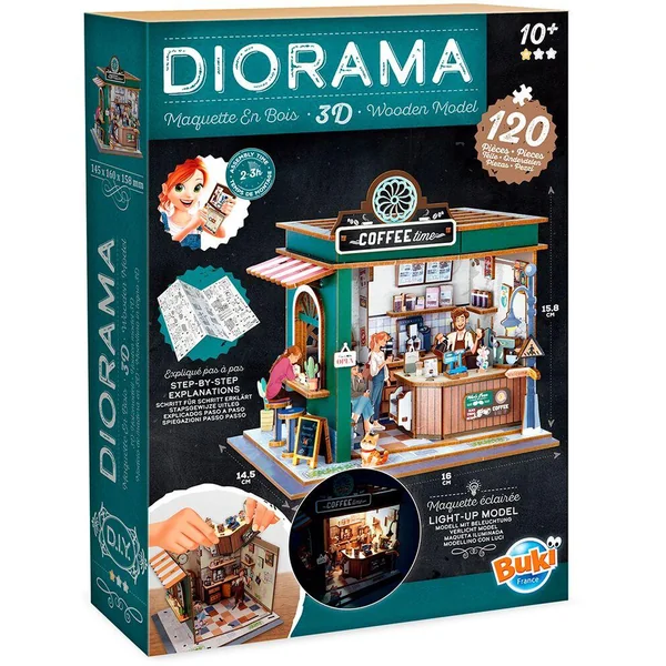 Une fois terminé, ce diorama devient un magnifique objet de décoration pour ta chambre. Observe chaque détail : percolateur, gobelets, affichage… La nuit, utilise l’éclairage LED inclus pour illuminer l’intérieur de ton café.