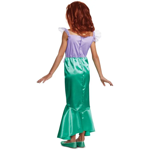 Déguisement Ariel version classique. Pour enfant. Taille 5-6 ans. Telle une véritable sirène, pars à l’aventure dans le Royaume imaginaire d’Atlantica grâce à ce déguisement Ariel. Il se compose d’un haut mauve imprimé effet sequins et en son centre différents graphiques marins surmontés d’un camée à l’effigie d’Ariel. A la ceinture, un galon argent et des froufrous mauves. Une jupe verte près du corps avec un bas évasé permettant une mobilité aisée. Matière : 100% Polyester. Entretien : Lavage à la main – Ne pas utiliser d’agents blanchiment – Pas d’entretien à sec. Déguisement sans accessoires. Chaussures non fournies.